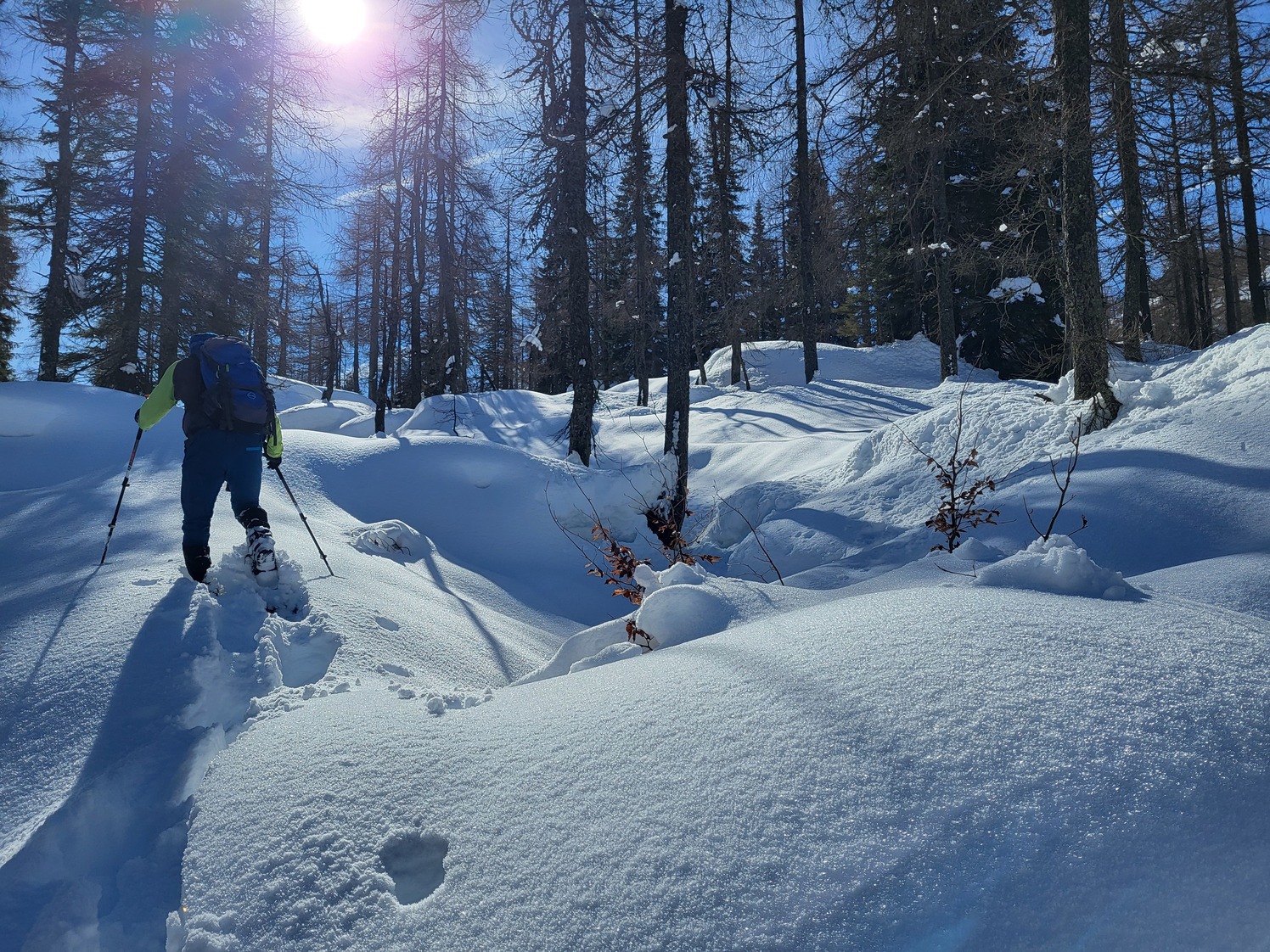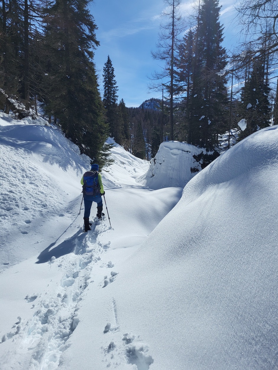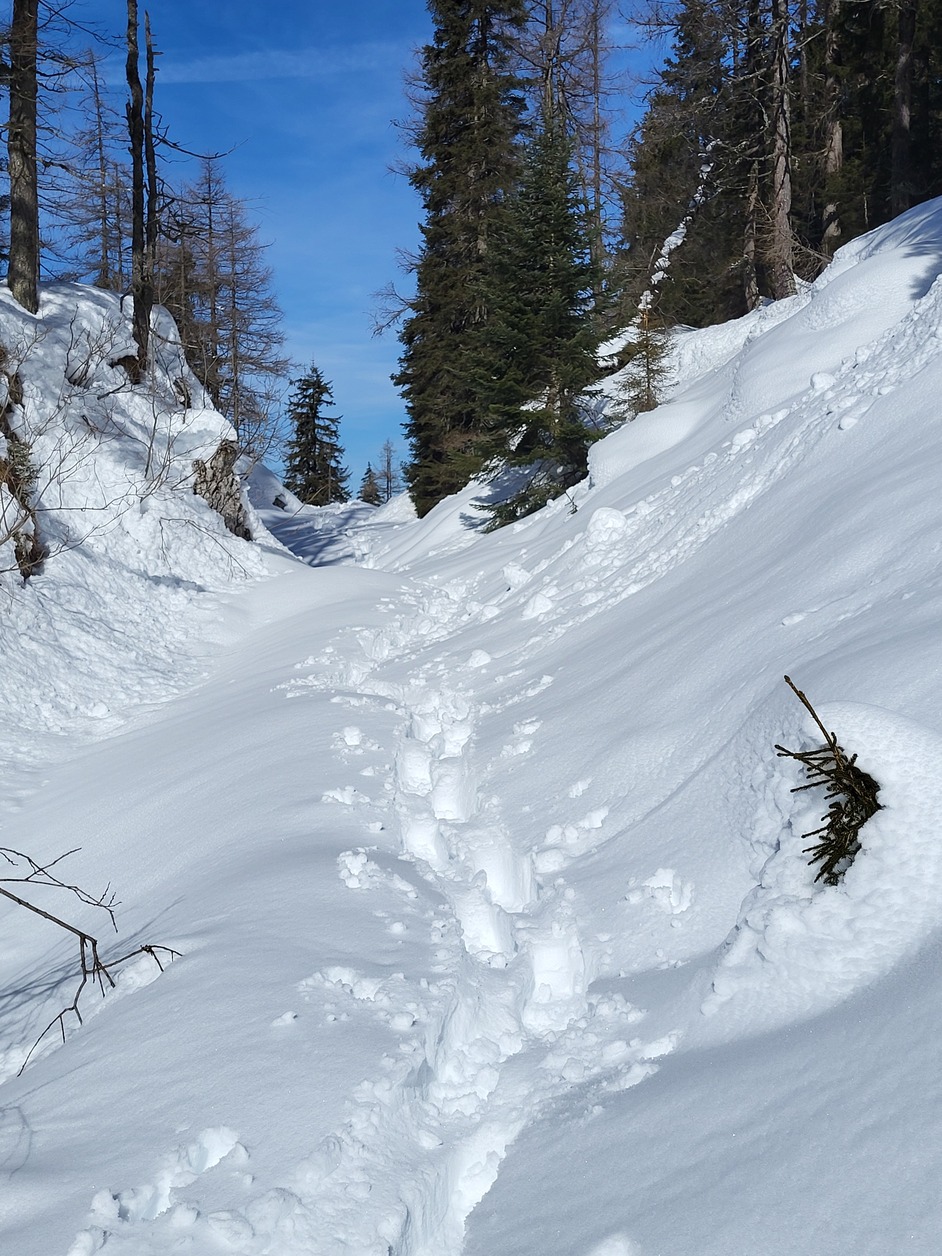 Fahrt zum Gleinkersee. Mit Grödel die 3 "Steilstufen" rauf zur Abzweigung "Dümlerhütte". Dann ist es Zeit für die Schneeschuhe. Gott sei Dank hat den nächsten Hang (gute halbe Stunde) schon ein 2-er Team gespurt - leider