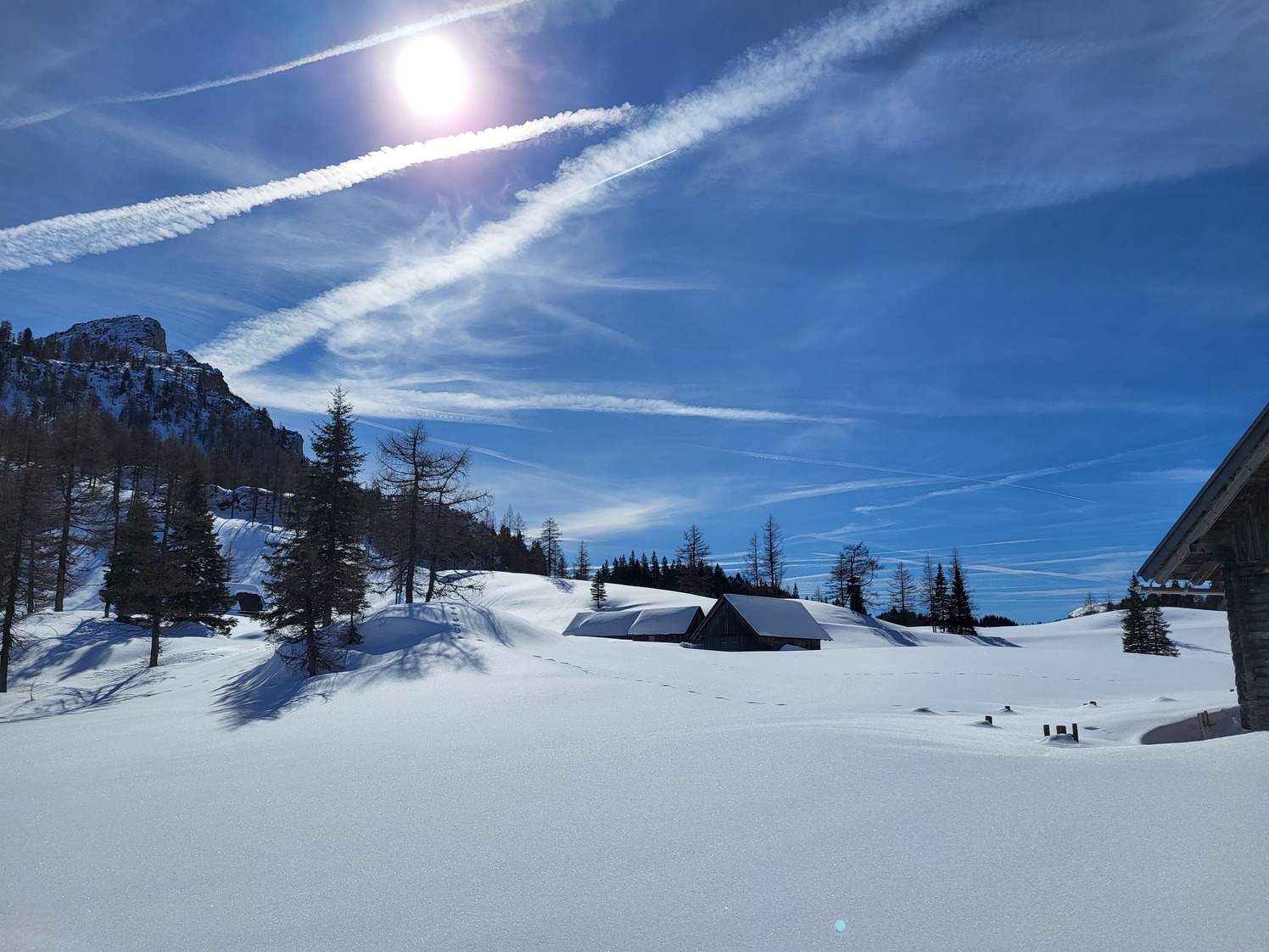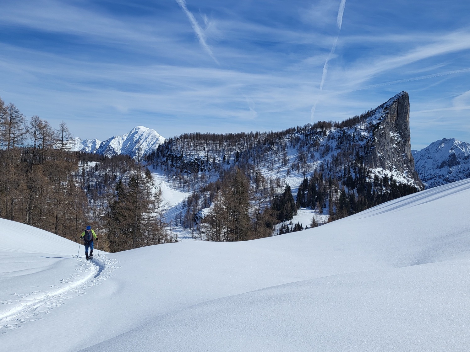 Für uns (Gabi und meiner Wenigkeit) geht es weiter bergauf zur Abzweigung "Seespitz". Der Schnee ist inzwischen tief und pappig - obwohl er vom Aussehen "Pulverschnee" suggeriert. Ich bin schon ziemlich ausgepumpt (obwohl Gabi die meiste Spurarbeit erledigt) bei der Stubwiesalm. Ein Müsliriegel gegen körperlichen Verfall und dann rauf auf den Hals-Sattel. Bei diesem Schnee ist selbst der Abstieg zur Zick-Hütte anstrengend.