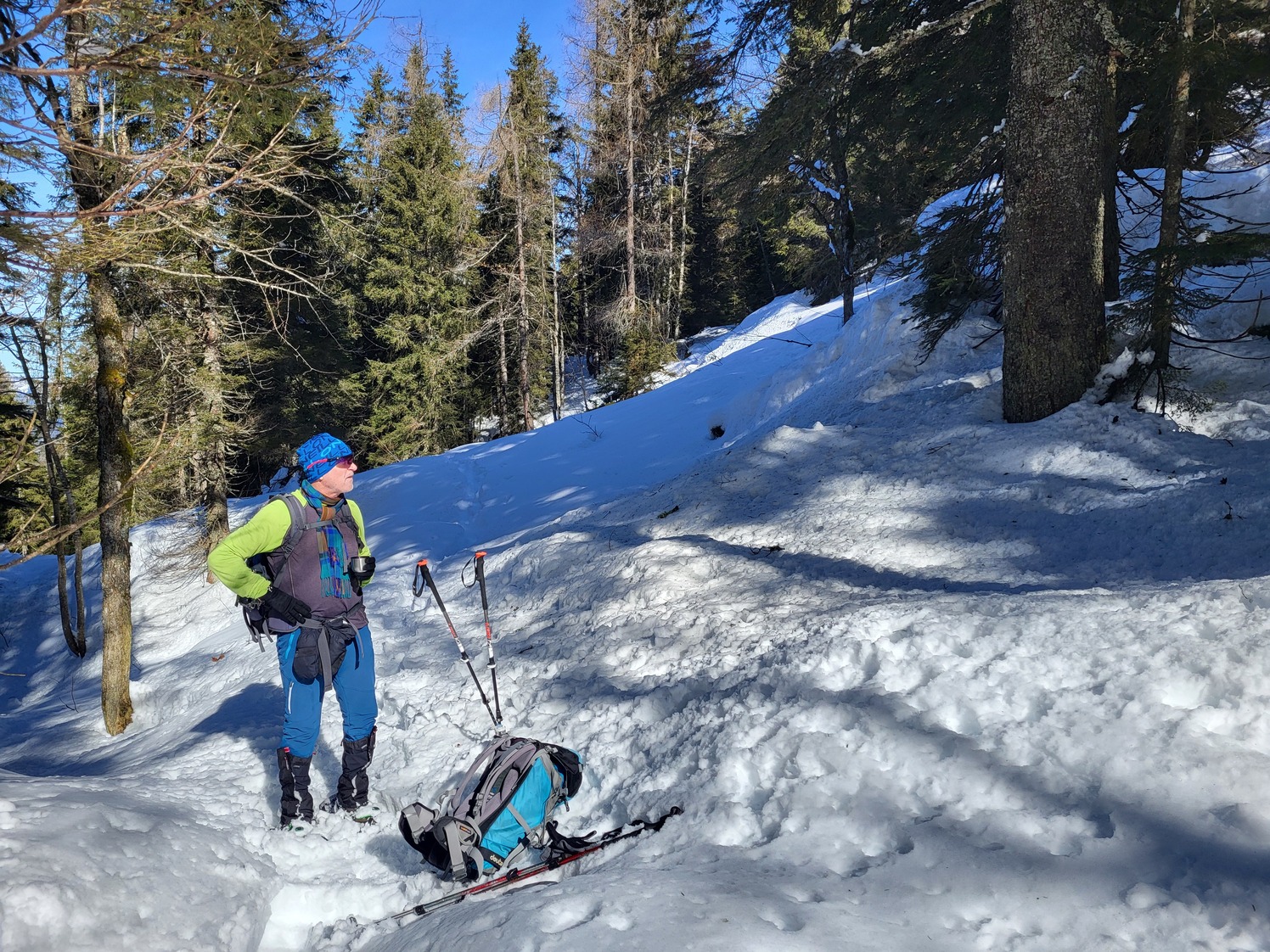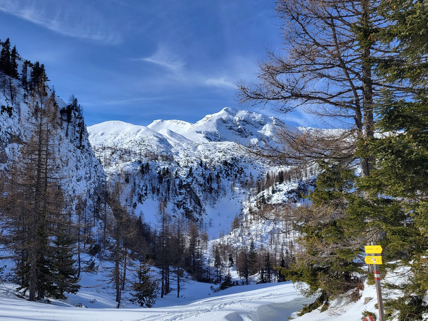 Fahrt zum Gleinkersee. Mit Grödel die 3 "Steilstufen" rauf zur Abzweigung "Dümlerhütte". Dann ist es Zeit für die Schneeschuhe. Gott sei Dank hat den nächsten Hang (gute halbe Stunde) schon ein 2-er Team gespurt - leider