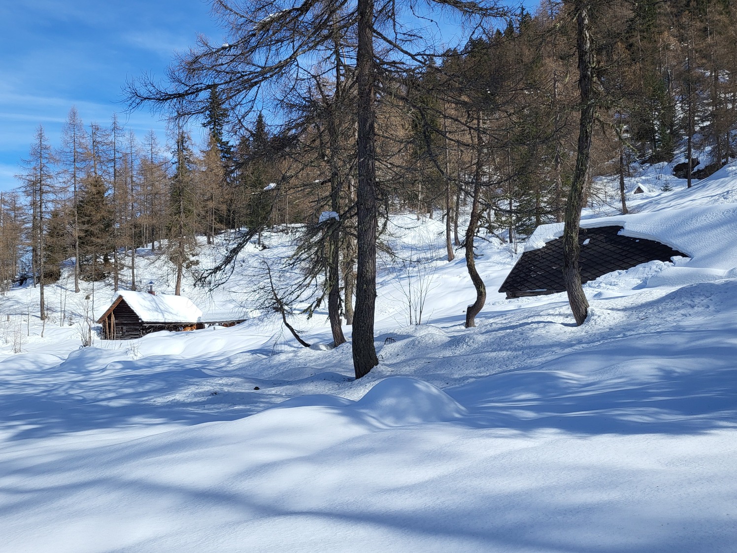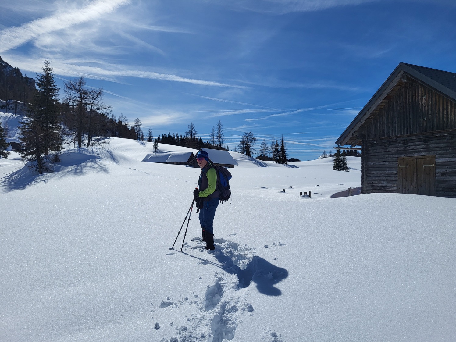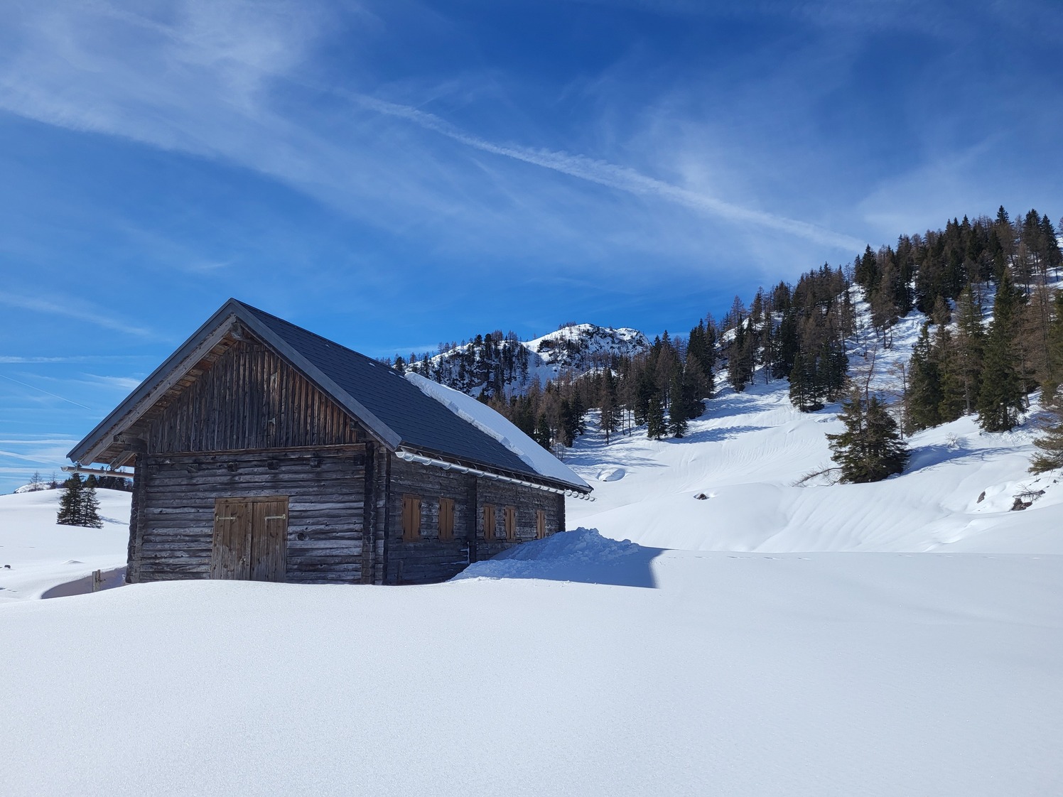 Für uns (Gabi und meiner Wenigkeit) geht es weiter bergauf zur Abzweigung "Seespitz". Der Schnee ist inzwischen tief und pappig - obwohl er vom Aussehen "Pulverschnee" suggeriert. Ich bin schon ziemlich ausgepumpt (obwohl Gabi die meiste Spurarbeit erledigt) bei der Stubwiesalm. Ein Müsliriegel gegen körperlichen Verfall und dann rauf auf den Hals-Sattel. Bei diesem Schnee ist selbst der Abstieg zur Zick-Hütte anstrengend.